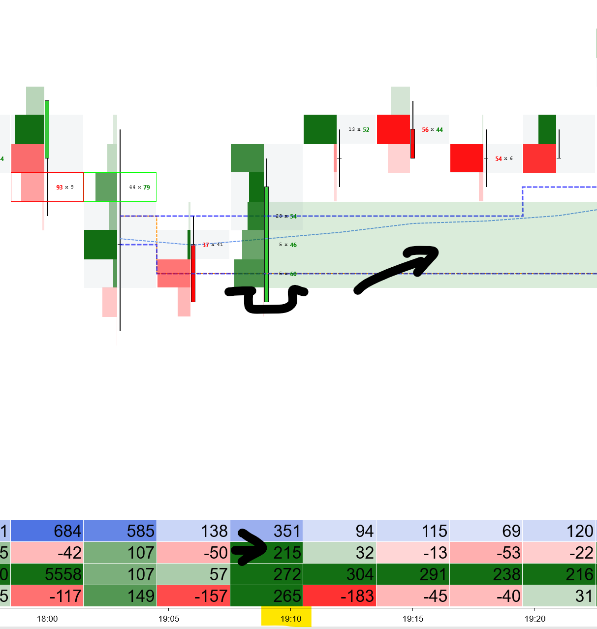 It is observed that on the previous day at 18:10 (shown as 19:10 on the chart due to a 1-hour delay in NinjaTrader relative to New York time, which I will adjust later), there was a strong positive delta shift at three price levels with a value of +215.