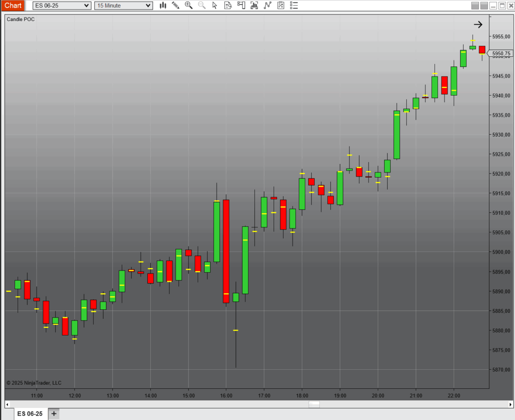 Instead of showing one large volume profile over a session or range, Candle POC breaks it down to the candle level.